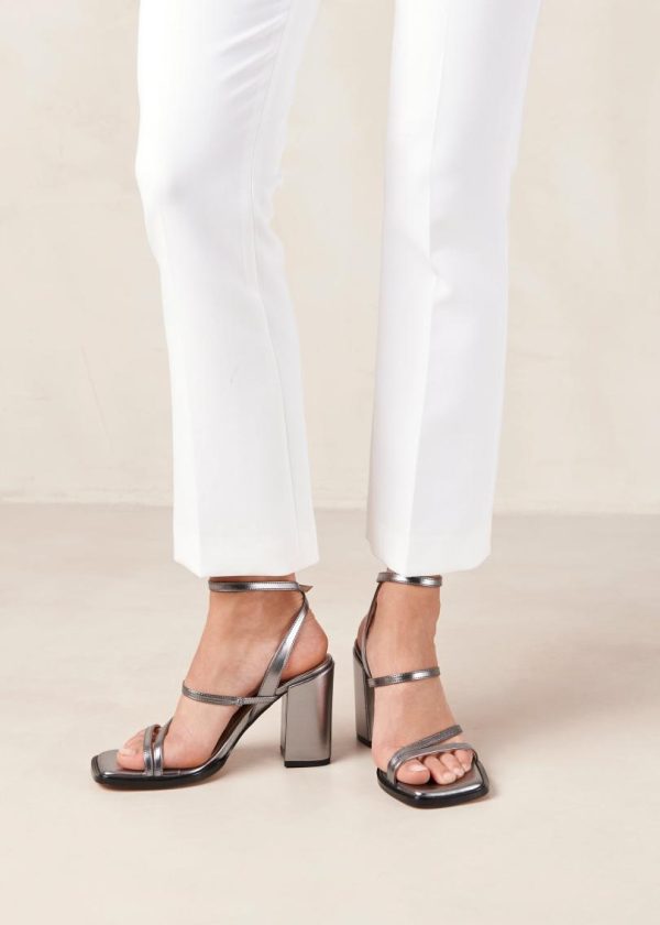 Silver vegan leather strappy sandals with metallic finish