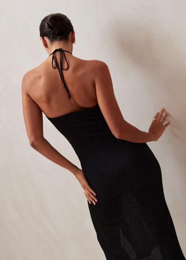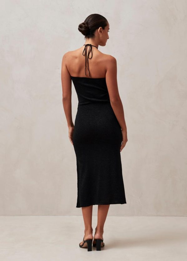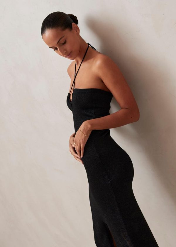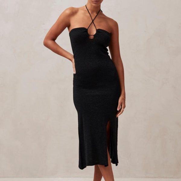 Command attention on the dance floor with this stunning black knit dress. Expertly crafted with a sophisticated blend of viscose and shimmering metallic fibers that catch the light beautifully. Features a sleek halterneck design with adjustable crossover ties for a customizable fit, plus a flattering side slit that elongates your silhouette. Pair with our Bellini heels for an unforgettable party look.