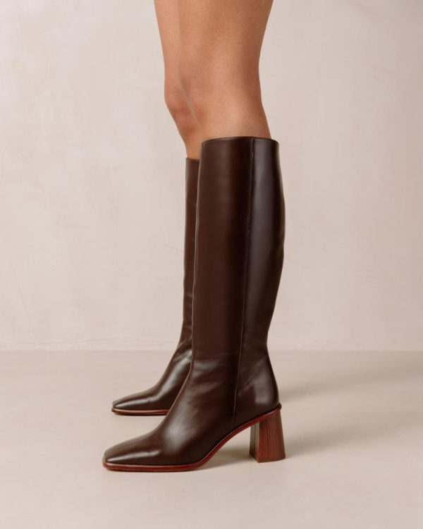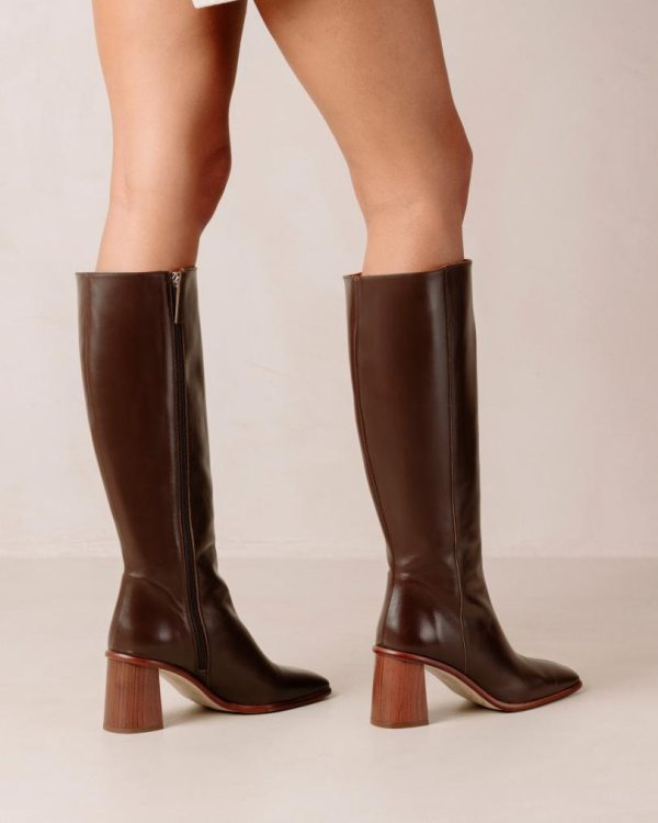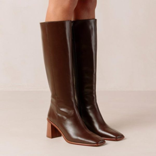 Discover the essential knee-high boots crafted from premium sustainable brown leather. These classic tall boots feature a contemporary squared toe and convenient side zipper for easy wear. The substantial block heel provides both stability and sophisticated elevation to your stride. Elevate your cold-weather wardrobe with these stylish East boots that combine fashion and function perfectly.