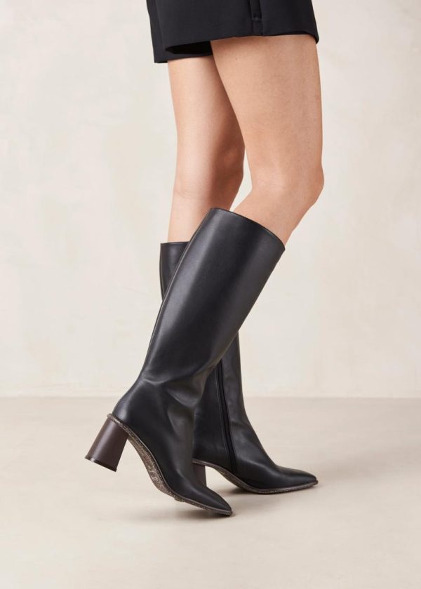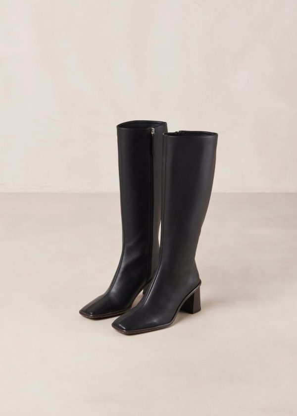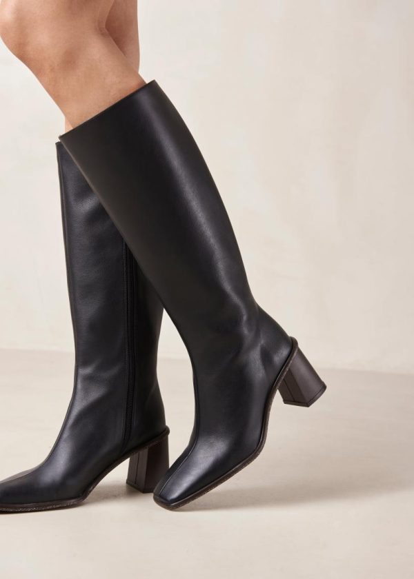 Black vegan leather knee-high boots with block heel