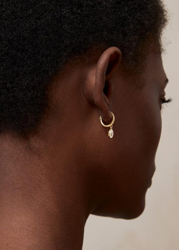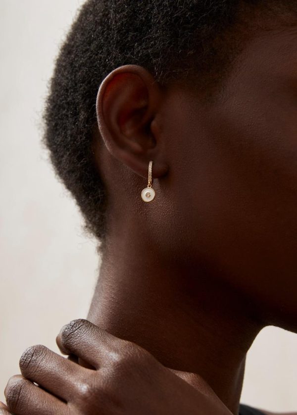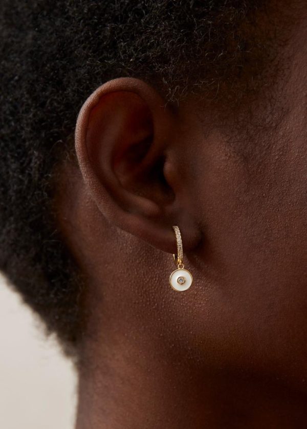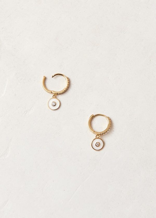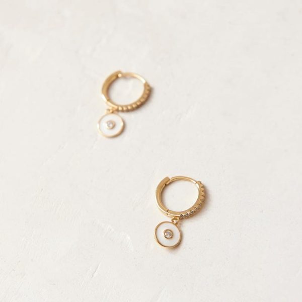 Elevate your jewelry collection with these stunning mini hoops, featuring not just a full row of sparkling crystals but also beautifully dangling circular charms. Each charm is expertly lacquered with crisp white enamel and centered with a brilliant gemstone for added sophistication. The clever hinged design makes these earrings perfect for wearing alone or effortlessly stacking with your favorite pieces to create a customized look.