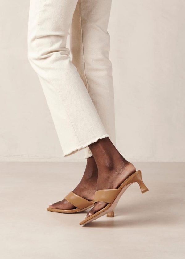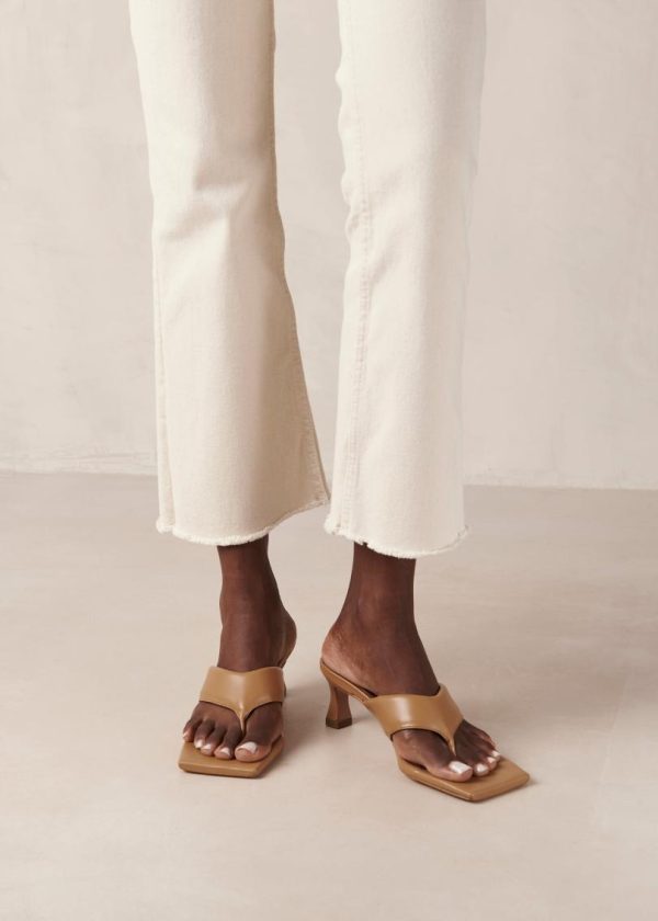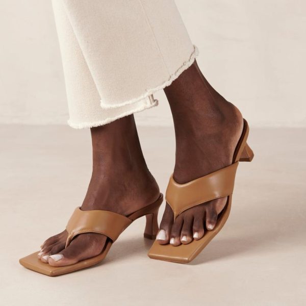 Sophisticated brown vegan leather thong sandals with chic kitten heel