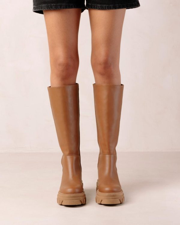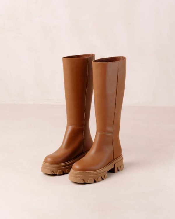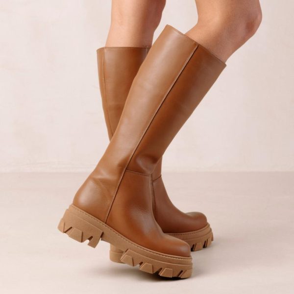Elevate your contemporary footwear collection with the stunning Katiuska boots. These modern knee-high boots feature premium brown leather construction and stand out with their fashion-forward platform design. The streamlined slip-on silhouette hits just below the knee with a comfortable relaxed fit around the legs, allowing you to layer your favorite cozy socks underneath. Experience exceptional warmth and comfort that will keep your feet protected all winter season.