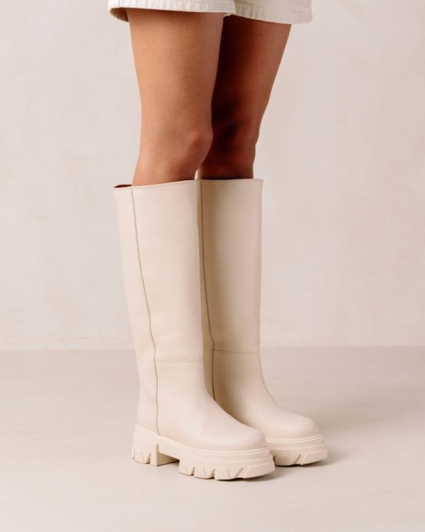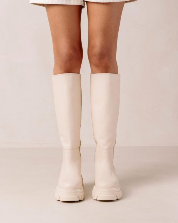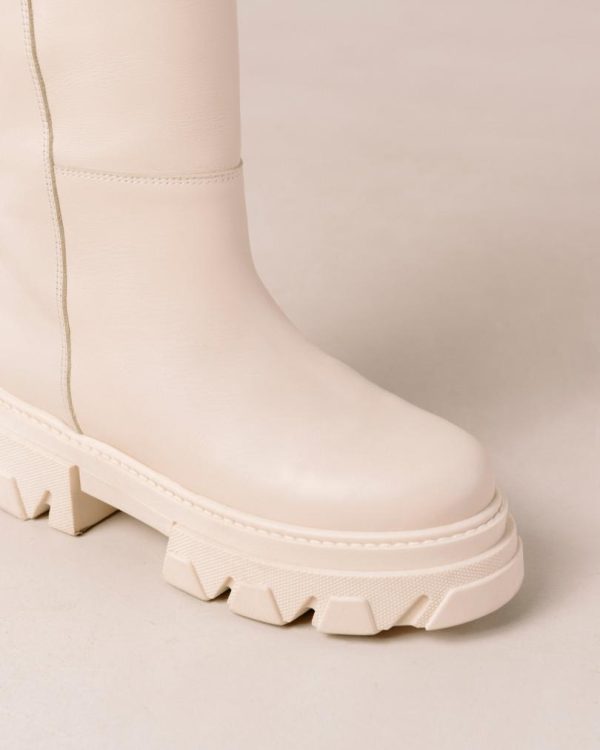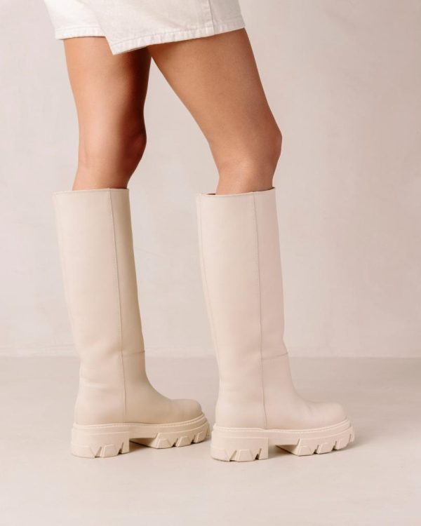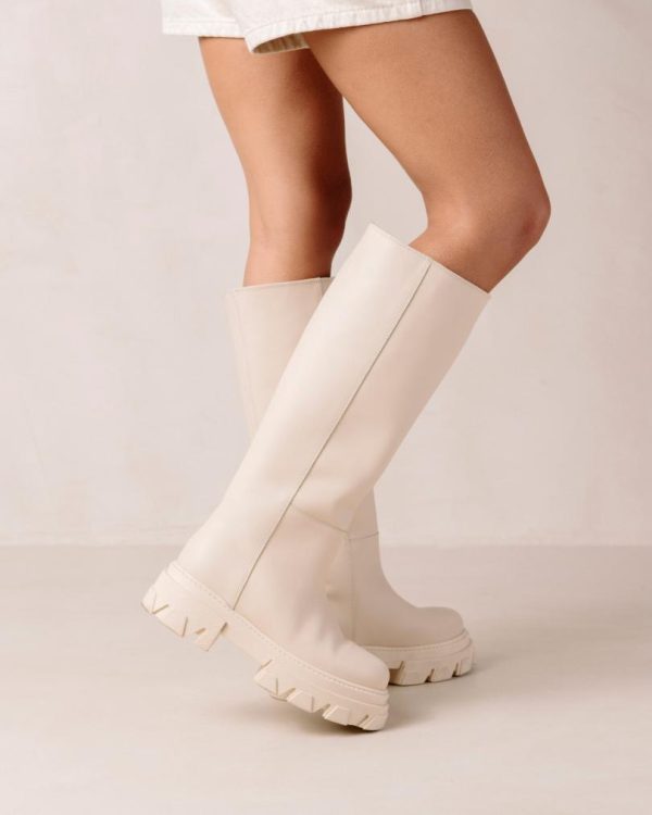 Elevate your contemporary footwear collection with the stunning Katiuska boots. These modern knee-high boots feature premium white leather construction and stand out with their eye-catching platform design. The streamlined slip-on silhouette hits just below the knee with a comfortable relaxed fit around the legs, allowing you to layer with your favorite cozy socks. Experience exceptional warmth and comfort throughout the winter season.