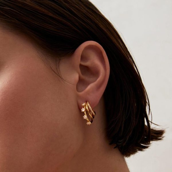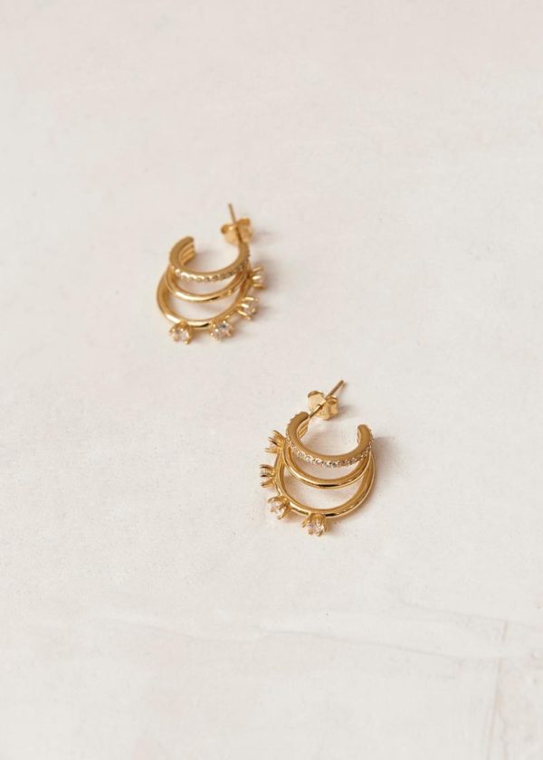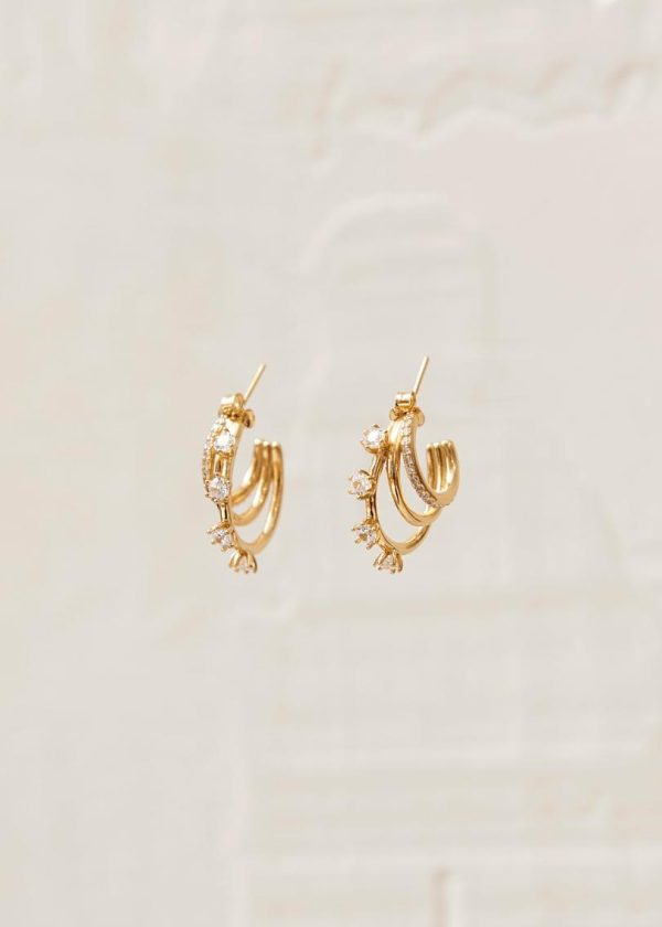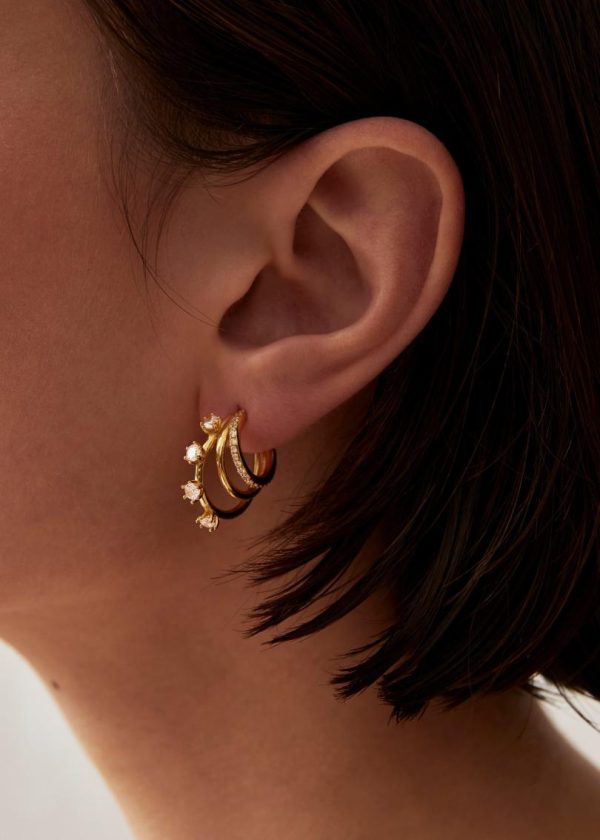 Elevate your jewelry collection with these stunning statement earrings. Our Kingdom design features three graduated hoops adorned with brilliant white crystals, creating maximum sparkle and dimension in a single piece. These versatile earrings complement any outfit in your wardrobe and are crafted from premium gold plated silver for lasting beauty and durability.