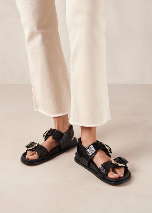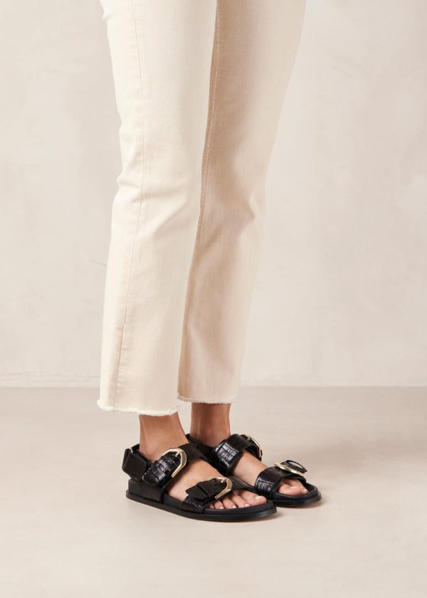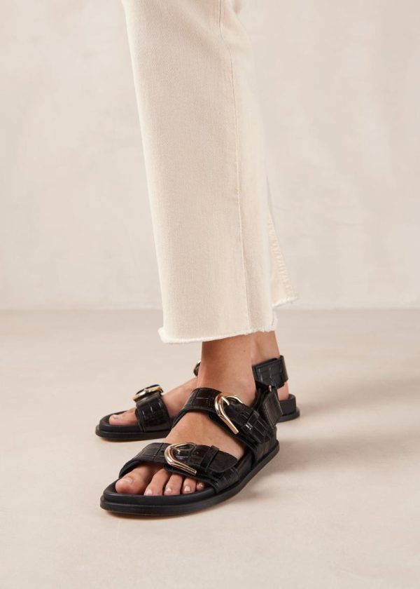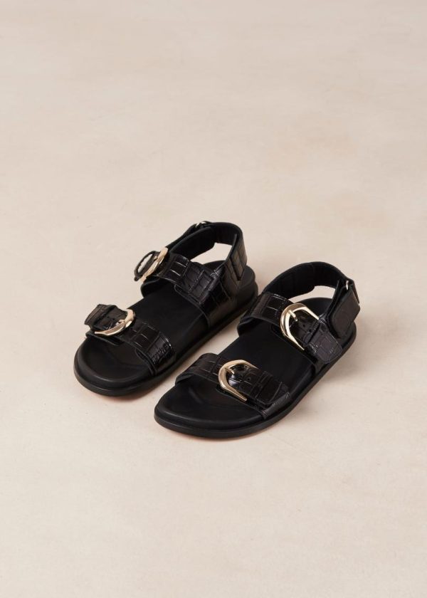 Sophisticated black croco-embossed leather sandals featuring a chic double-strap design