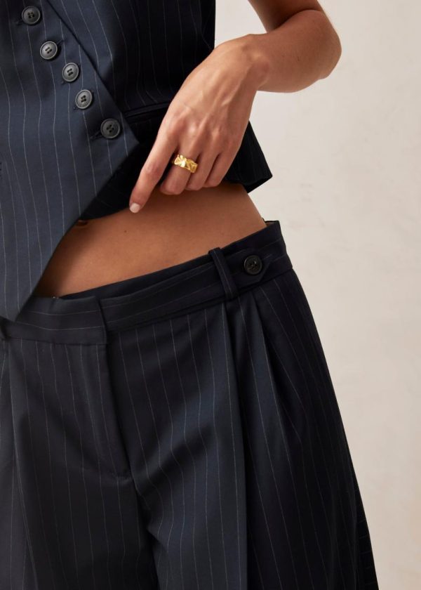 Meet the Megan pants, expertly tailored with elegant pinstripes that create a flattering elongated silhouette. Designed with a comfortable relaxed fit, these statement-making trousers feature wide legs accentuated by crisp pleats and precise darts. Perfect for both office and evening wear, simply tuck in your favorite top into the high-rise waistband for a polished look. Complete your ensemble by pairing with our matching blazer for a perfectly coordinated outfit.