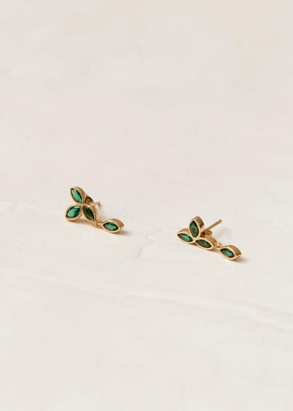 Elegant gold sunflower drop earrings with vibrant green crystals