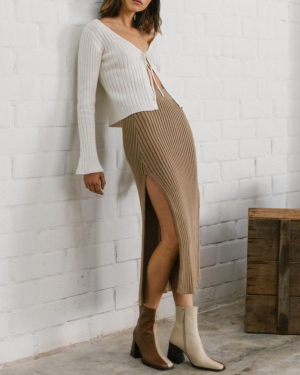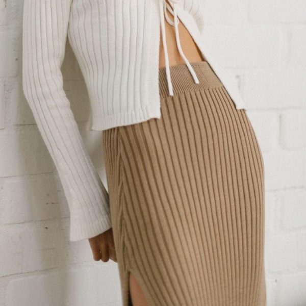 Discover the perfect blend of comfort and sophistication with this beautifully crafted brown high-waisted skirt. Expertly designed with a premium knit construction, the Wise Camel Opened Knit Skirt offers exceptional softness and effortless style. The intricate textured pattern creates visual interest while the flattering high-rise silhouette enhances your natural curves. Perfect for creating versatile summer outfits when paired with your favorite tops and footwear. Shop this exclusive piece today at Alohas.io.