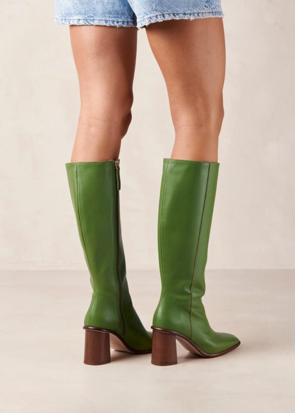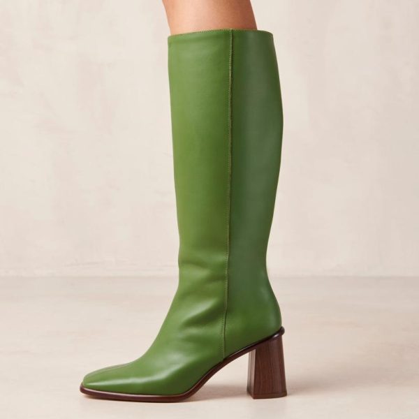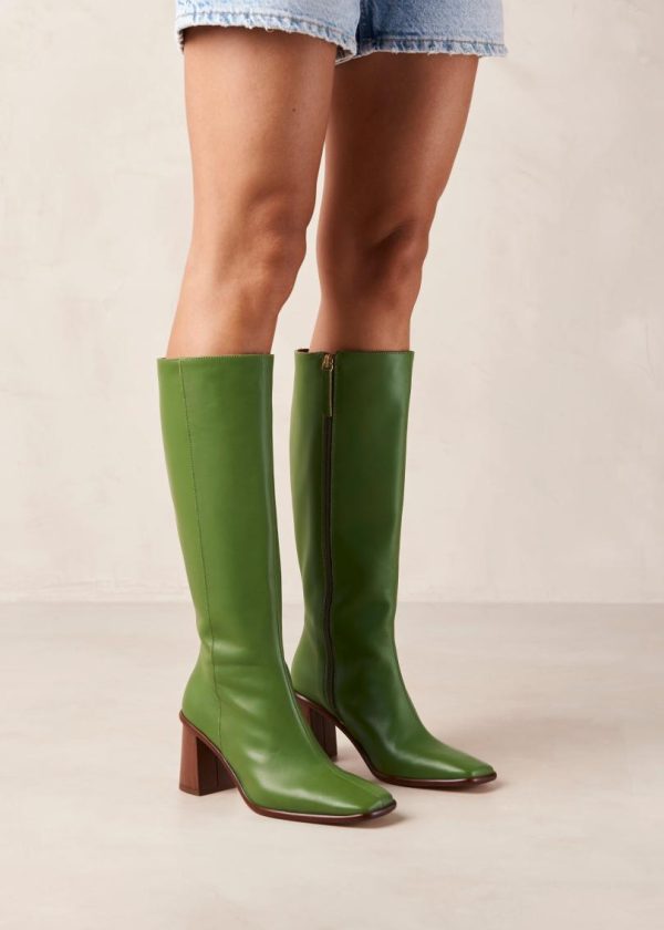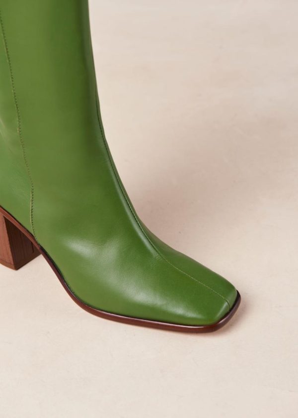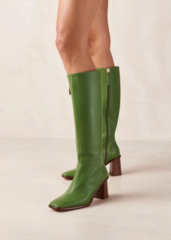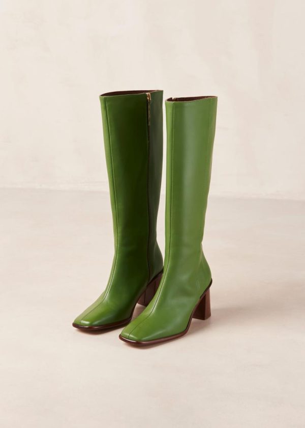 The iconic must-have high knees, now crafted from bold and bright green leather. These timeless tall boots feature a squared toe and a side zipper for extra comfort. Their elongated block heel adds flattery and pizzazz to your strut. Expand your footwear rotation with a glamorous pair of East and take on colder days in style.