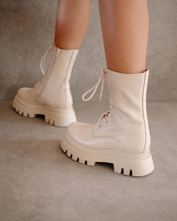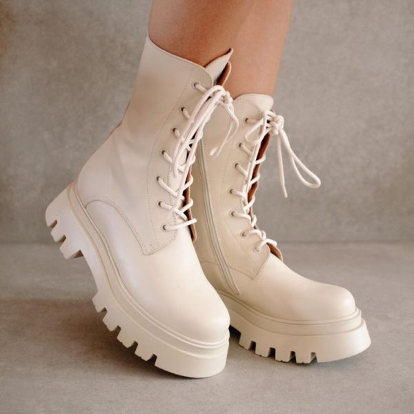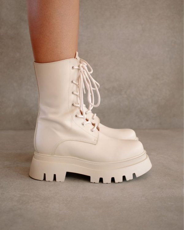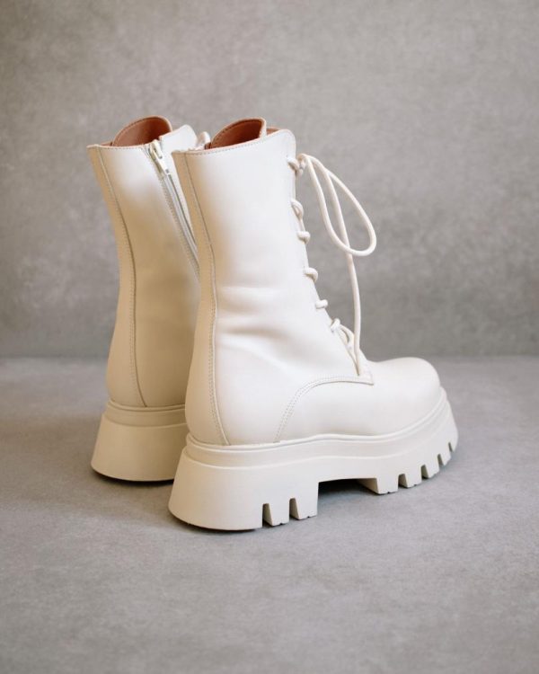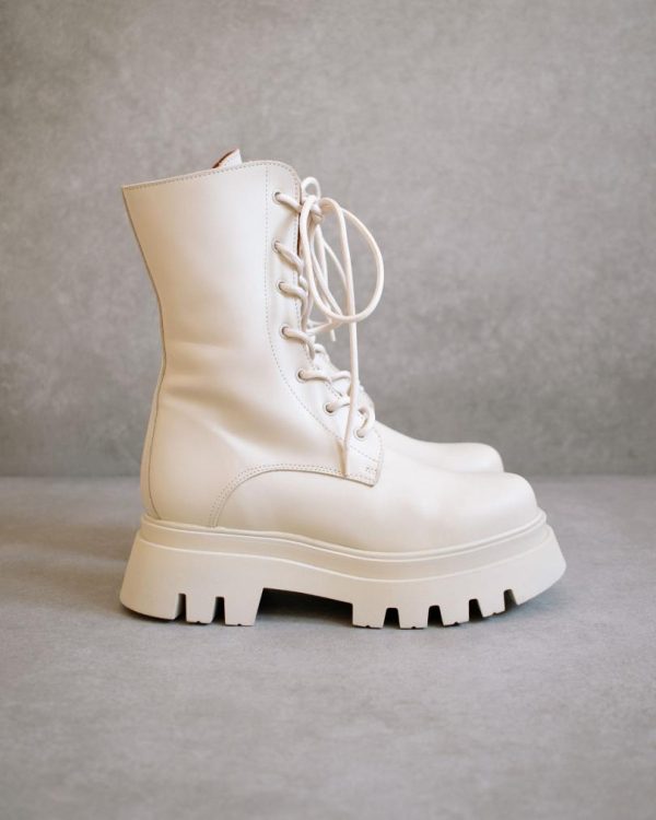 Tap into the combat boot trend with the Globetrotter. Versatile in white leather and durable with maxi rubber soles, these fashionable stompers will give any outfit a cool-girl edge. Tuck in your joggers or add a feminine contrast with a floral dress – these ankle height babies will help you navigate winter in style.