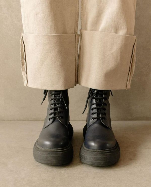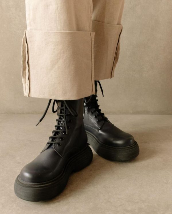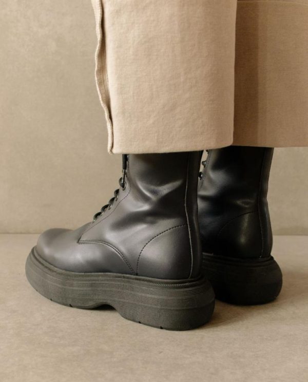Modeled on traditional combat styles, these vegan boots are made from black faux leather and sit high on the ankle. They rest on softly rounded, oversized soles that promise a little lift. Opt for an unexpected fashion combo by pairing them with your flirty summer dresses and mini skirts. They are just the perfect way to transition between seasons.
