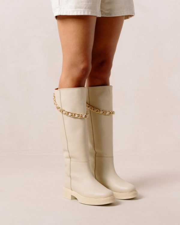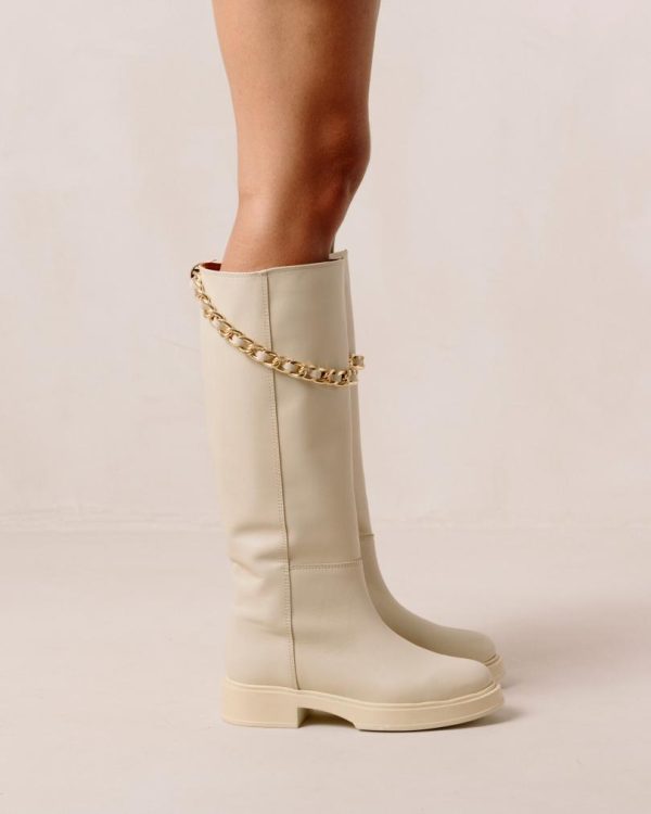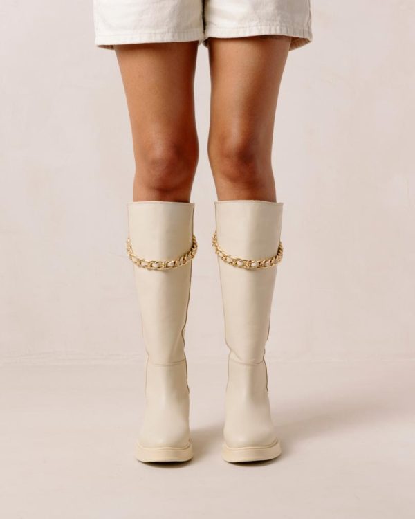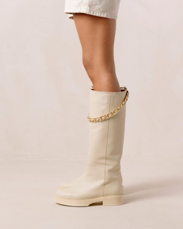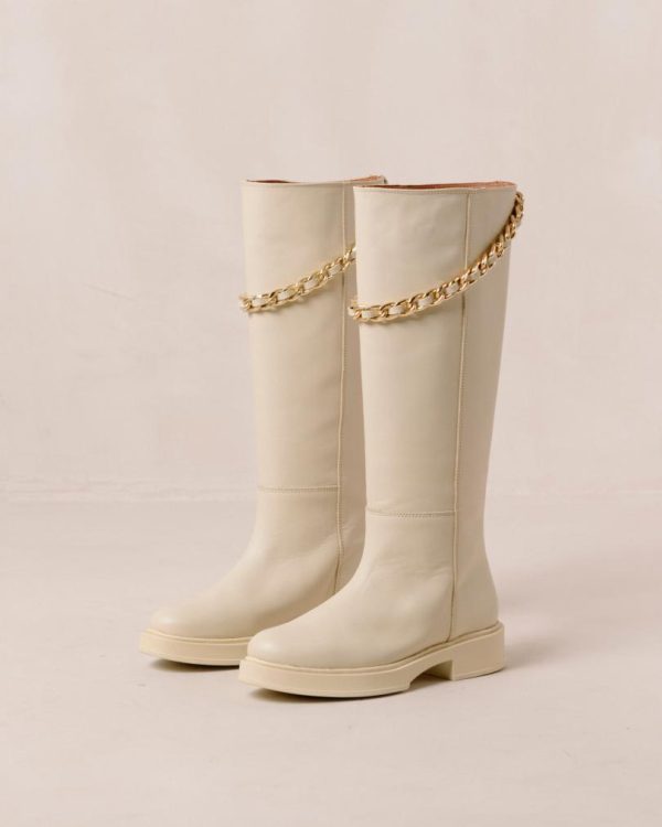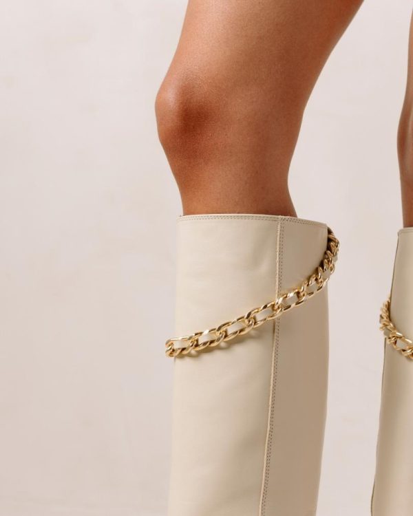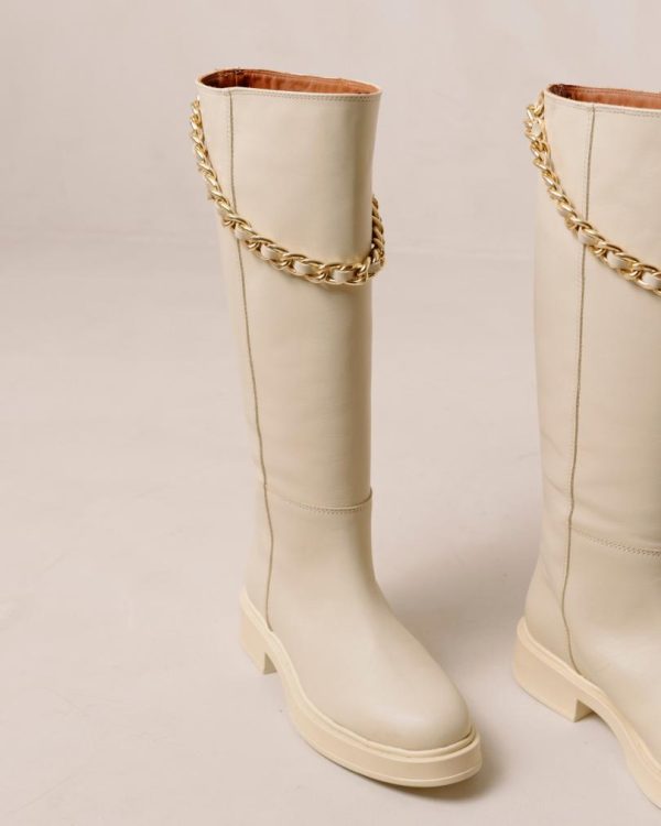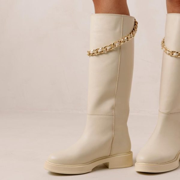 With neutral hues being a fall season must, these white leather tall boots are perfect for slipping on with your favorite trench coat. They have a low heel that subtly elongates the leg and are also topped off with a chunky gold chain that wraps around the leg – just another way to incorporate an extra dose of bling into your daily attire. Fabulous!