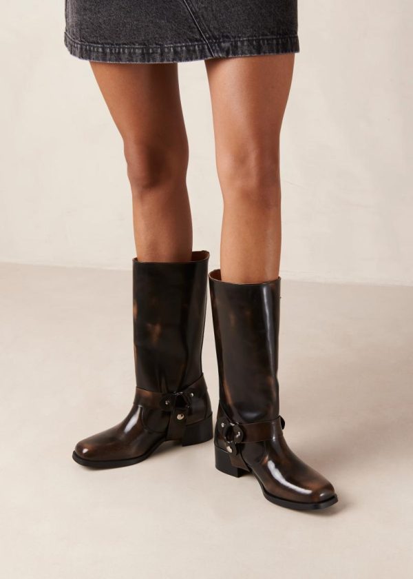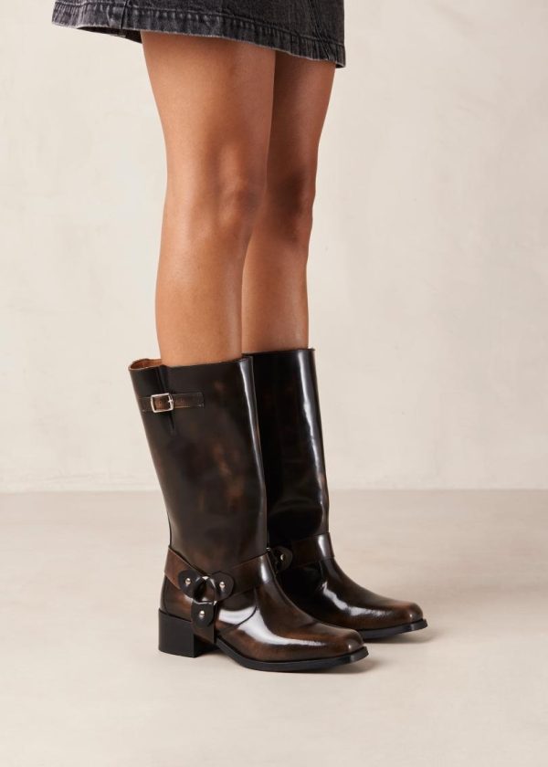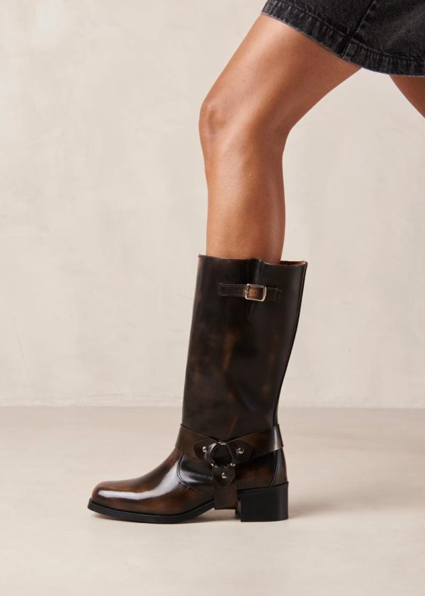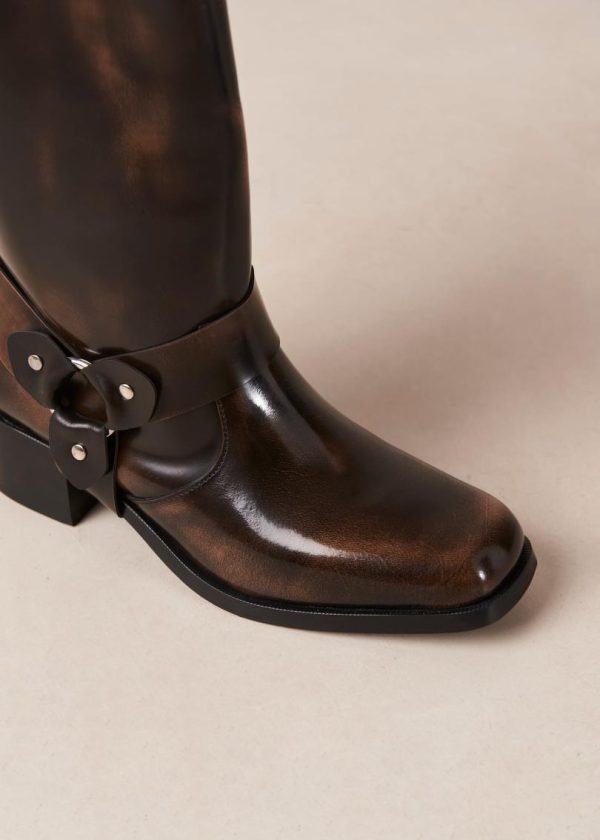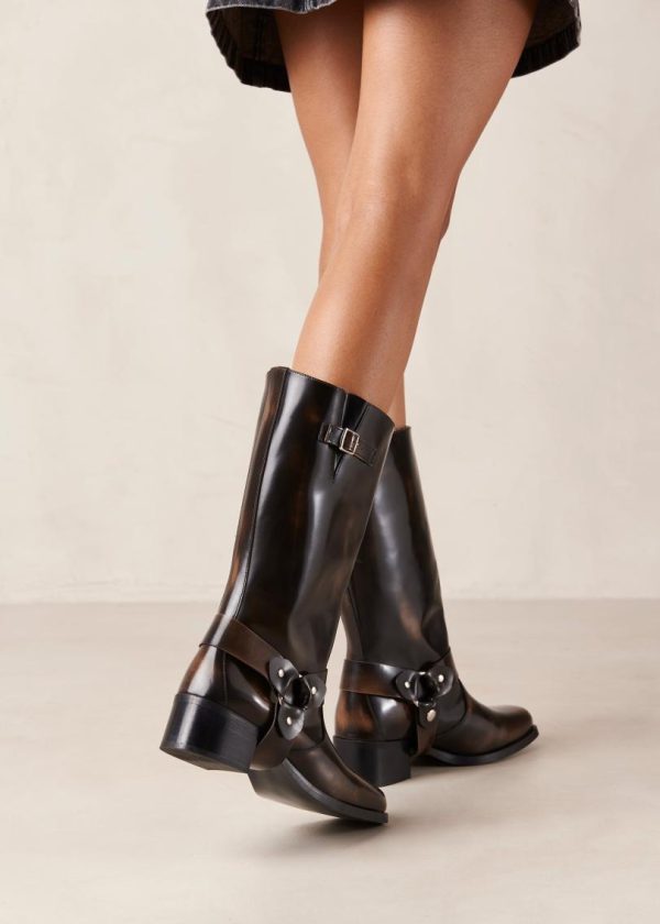 Made from brushed leather for a rugged finish, the Rocky biker boots look so badbass with a chunky heel, buckles, and riveted stirrup straps. Because they have extra wiggle room around the calf, they’re the perfect shoe to pull over leggings and slim-fitting pants.