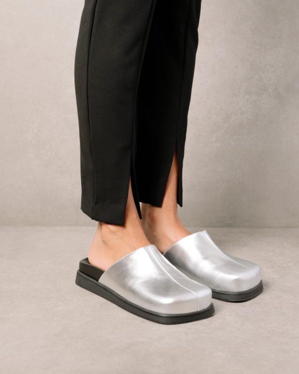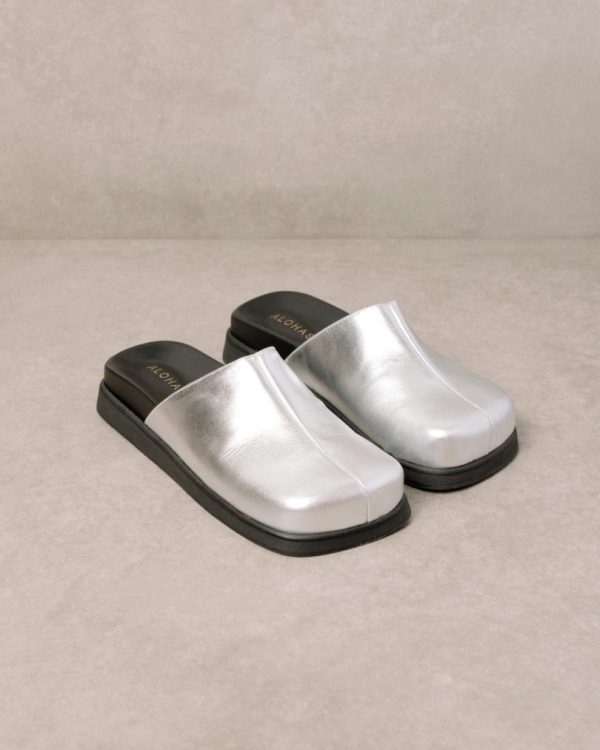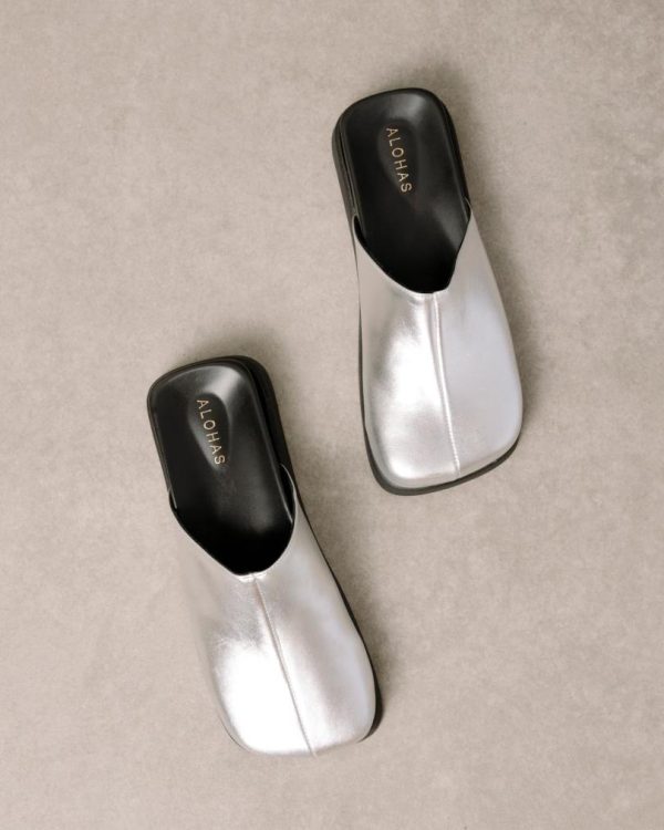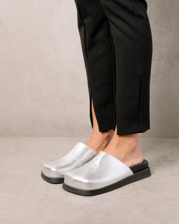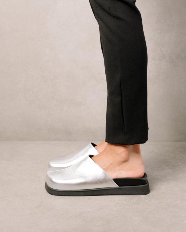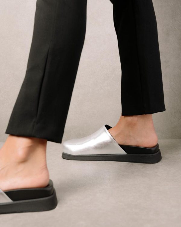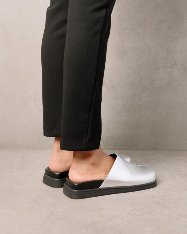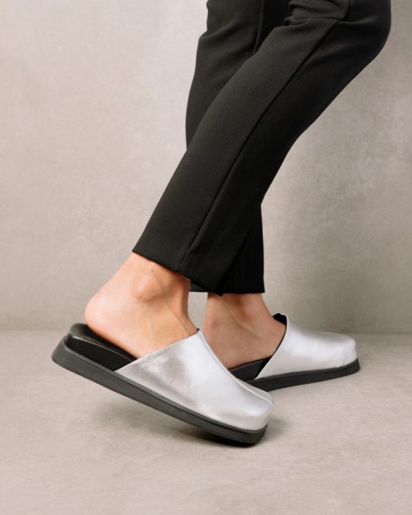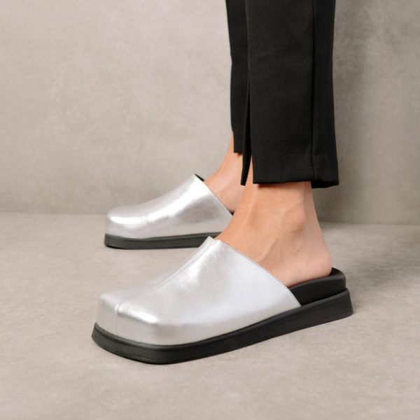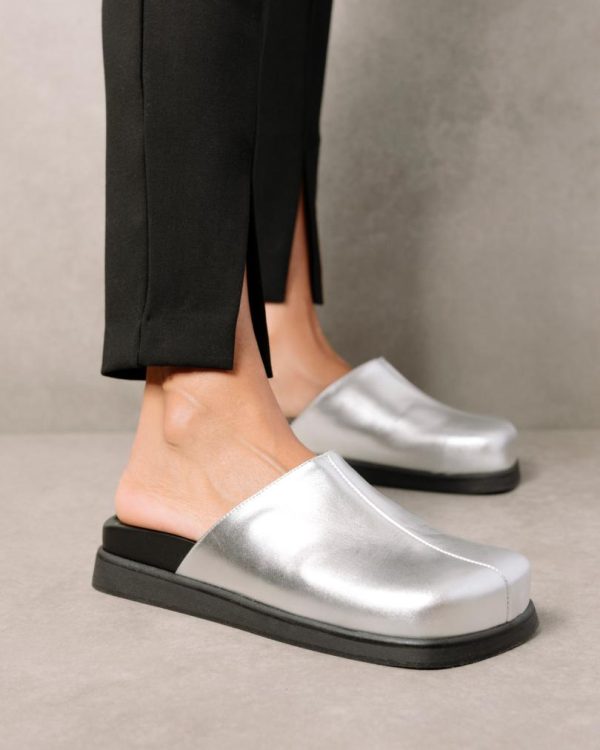 The perfect pair of “easy-on, easy-off” slides. Crafted from shiny silver leather, these flat mules are awesome enough for casual outings, but also comfy enough for chilling around the house. The rounded toe uppers rest on a comfortable 3.5cm rubber sole. A great no-frill shoe proving that a small style effort goes a long way.