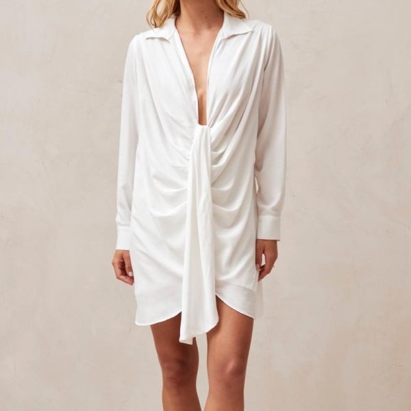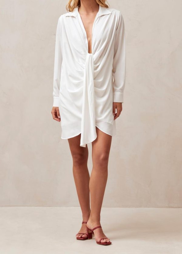 Artfully draped and knotted, the Liberica dress is cut from weightless white fabric and designed to float and flirty at your every move. It features a plunging neckline that adds some real drama to the pared-back chemisier silhouette. Throw on a pair of your favorite knee-high boots and some jewelry to make an outfit – sooo cute!