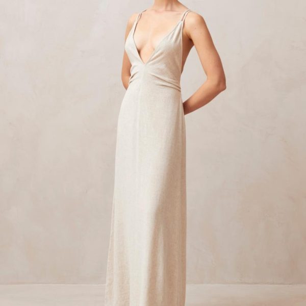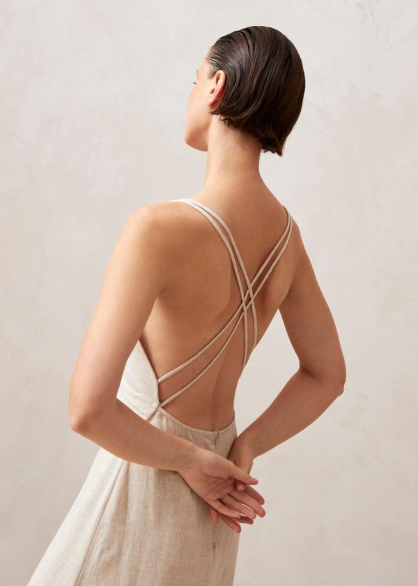 Designed to work on island time and during office hours alike, the Mia is a maxi dress cut from an airy linen blend in a natural beige shade. It features crossover spaghetti straps and a plunging neckline to display your favorite pendant. The floor-grazing hemline might require a bit of heel – wear yours with the Clara espadrilles to make summer dressing easy as a breeze.