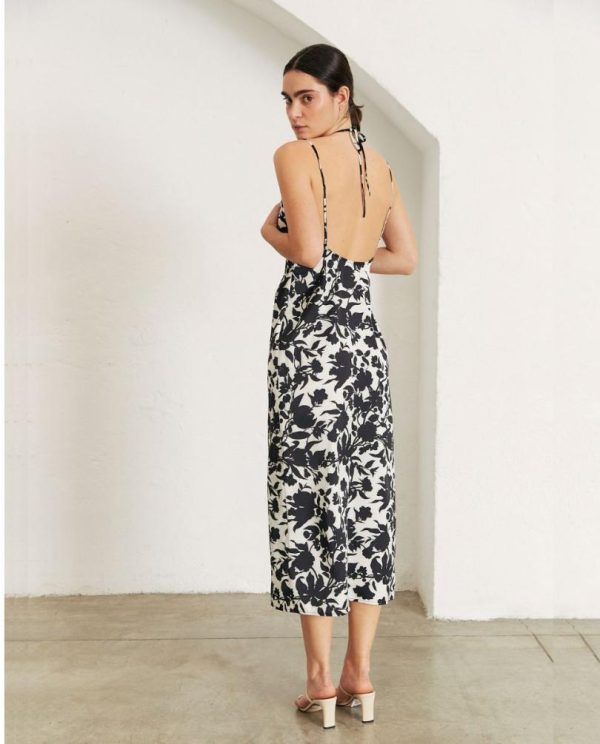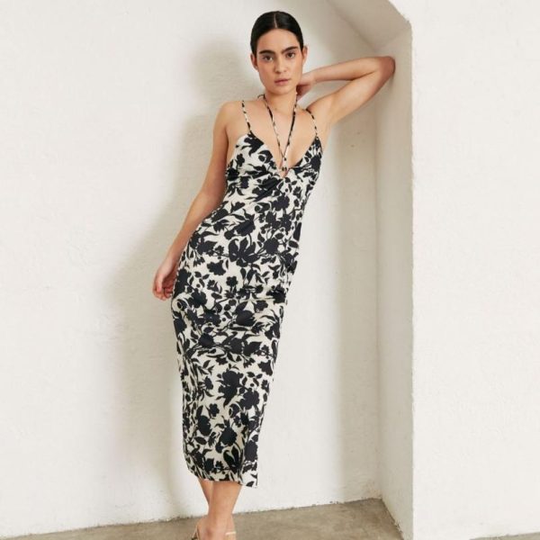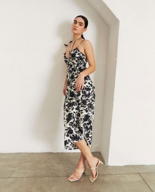 A breezy and feminine midi dress with a floral print, a V-neckline, and a wrap-style design.