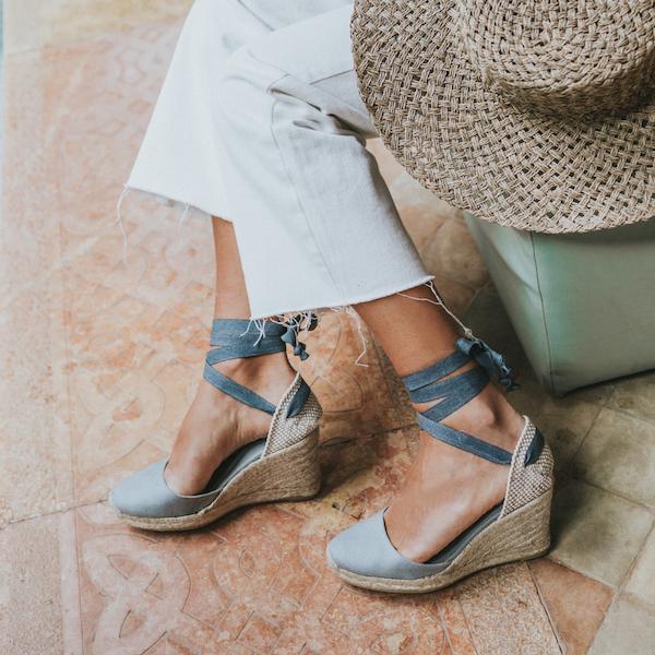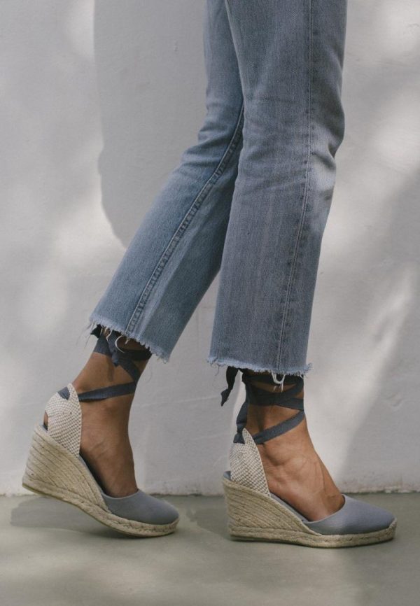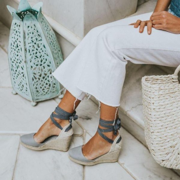 A signature style in the ALOHAS repertoire, the Clara espadrilles are handcrafted in Spain by local artisans.This gray pair is made from durable canvas and fitted with a traditional jute wedge sole. Wrap the long ties around your ankle and knot them in a pretty bow – you can wear them with flirty hemlines or style them with jeans to bring a bit of summer romance into fall.
