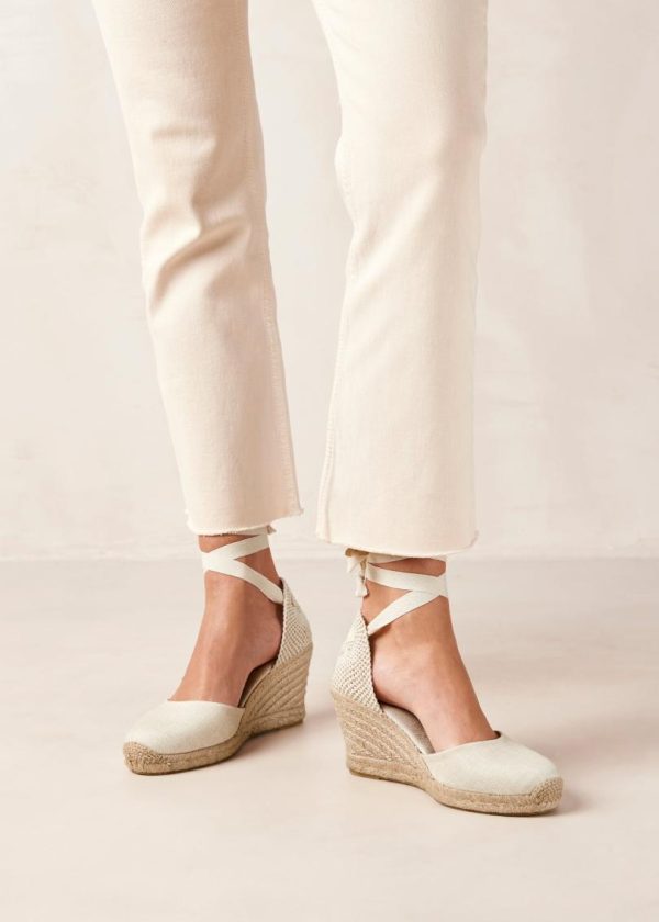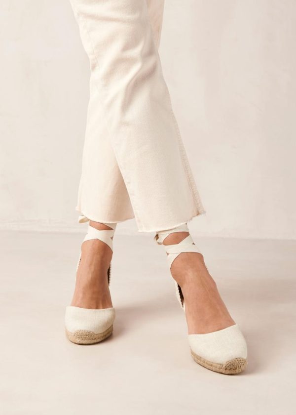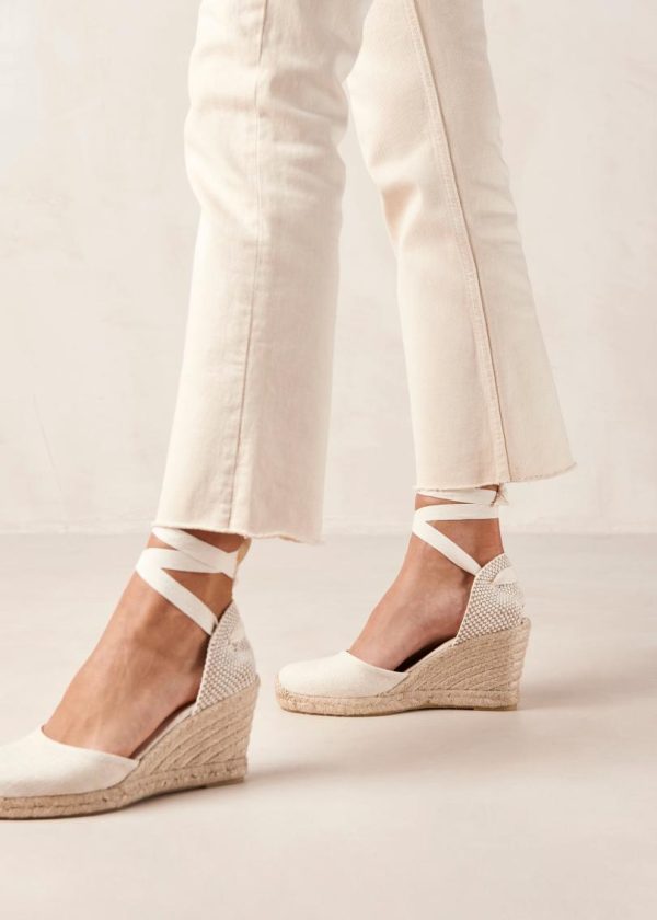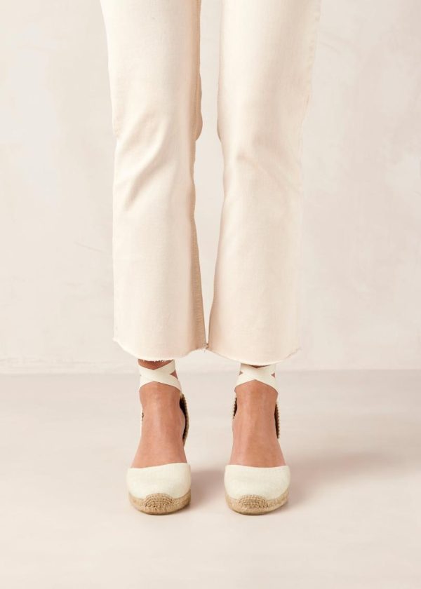 A signature style in our repertoire, the Clara espadrille wedges are handcrafted in Spain by local artisans.This white pair is made using organic cotton and fitted with a traditional jute sole. Wrap the long ties around your ankle and knot them in a pretty bow – wear them with flirty hemlines or style them with jeans to bring a bit of summer romance into fall.