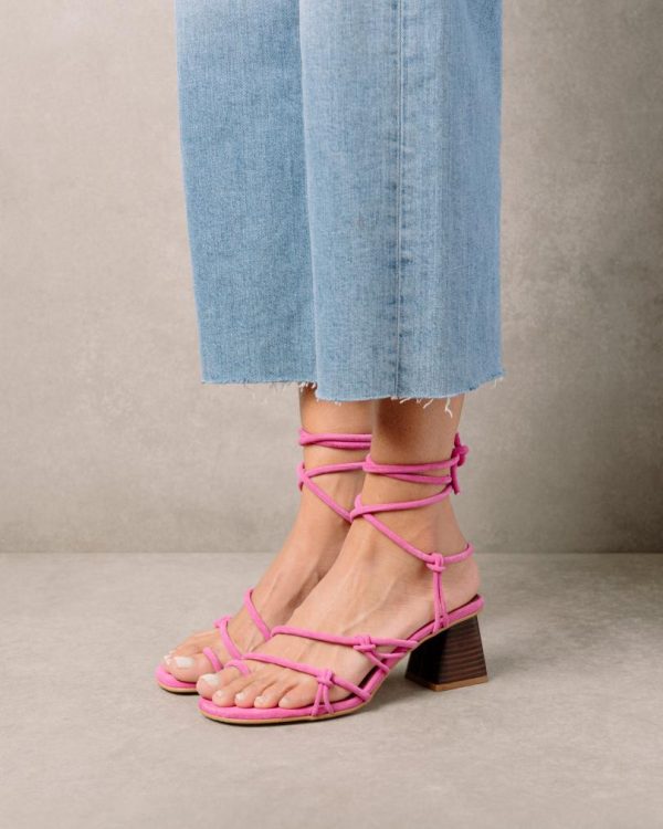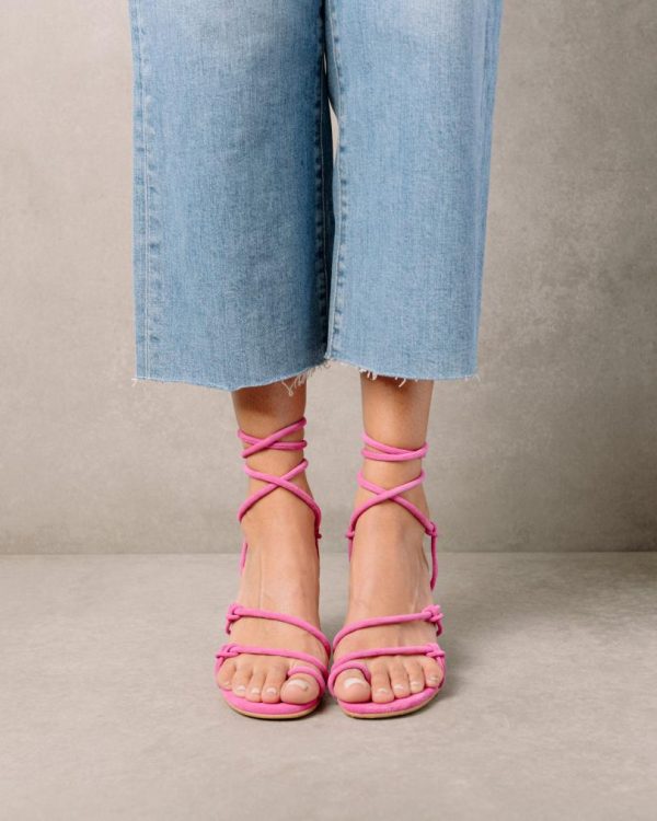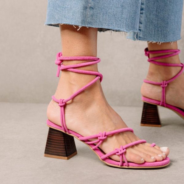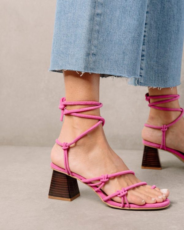 Strappy sandals are never an oldie but always a Goldie! Crafted from pink suede to an intricately knotted, lace-up silhouette, these gracious summer shoes are set on flared block heels, ready to elevate any look of your choice. Play with the long ankle ties to create your personalized style and fit.
