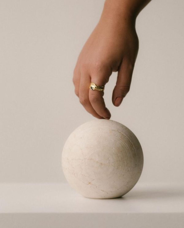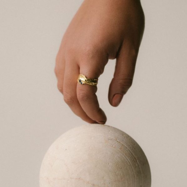 Crafted to resemble an heirloom from a glamorous, antique era, the Elixir ring is guaranteed to cast a spell. Centered with twinkling blue crystals, this unique jewelry piece has been artfully hammered and burnished for a “perfectly imperfect” finish. You won’t easily forget about it once its gorgeous golden glow has blinded you!