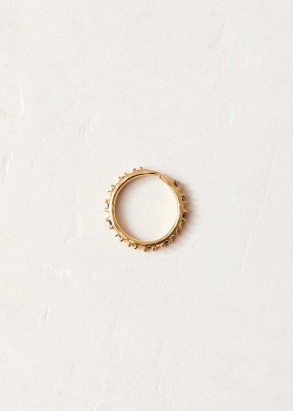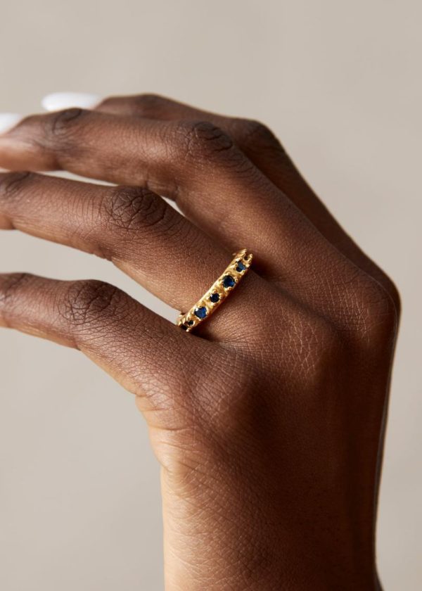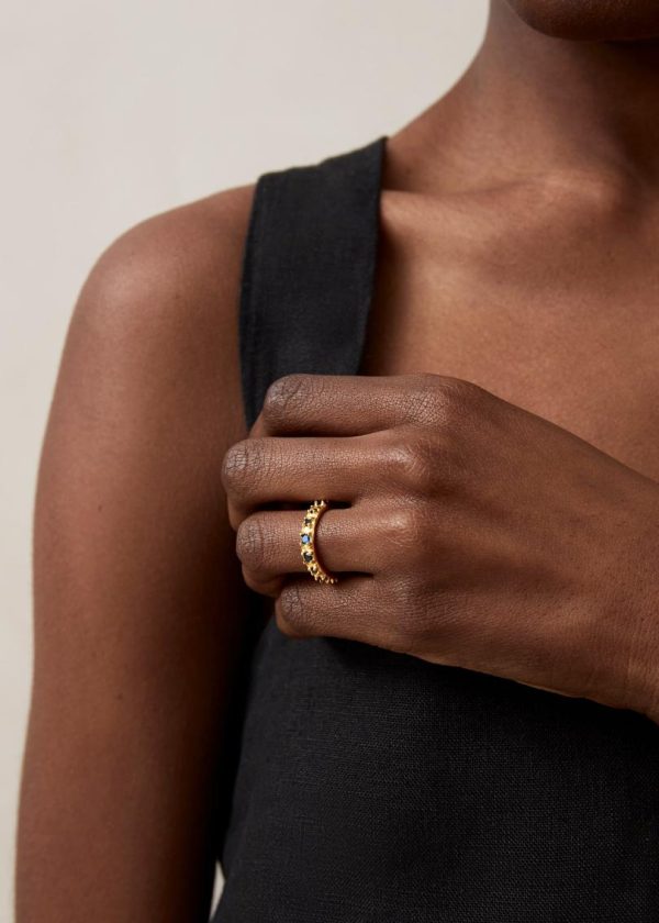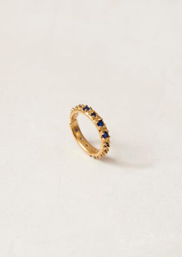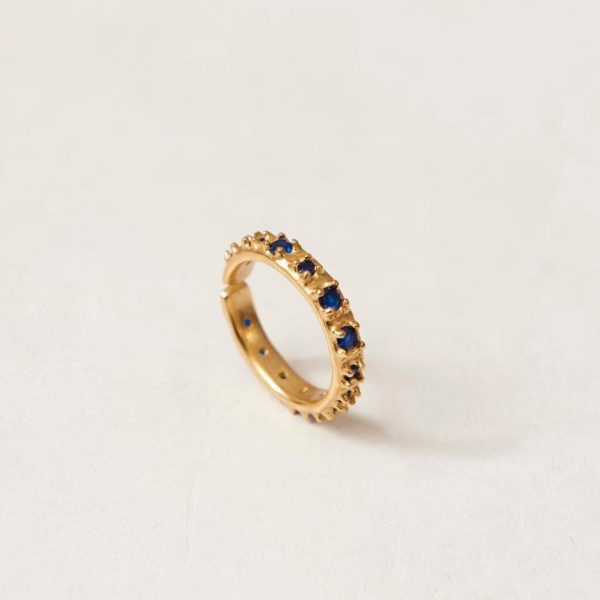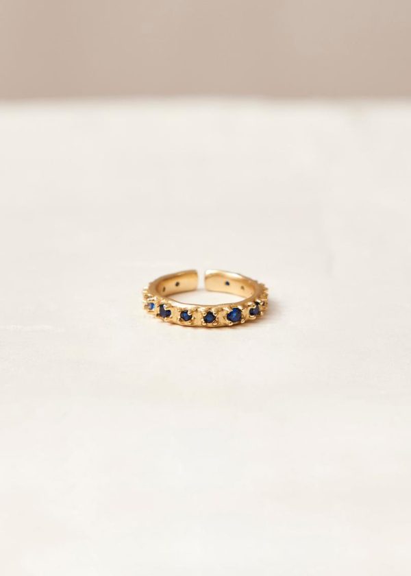 Bolt from the blue. The Reef is an adjustable ring in gold-plated silver with sapphire-looking gemstones. With crystals encrusted all along the band, this piece will color your world and manifest your mood. Stack it confidently with other bright styles to show your fun side.