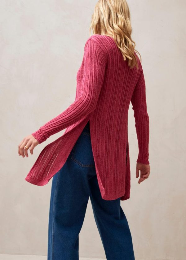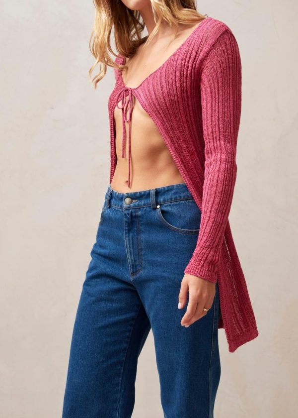Witty is the maxi cardigan you’ll be very happy to have in your closet. Rib-knitted from viscose-blend yarn, this pink sparkly top feels sexy yet practical at the same time. Throw it on top of dresses, bikinis or wear it with absolutely nothing underneath. It has a functional tie at the front for a secure fit across the chest.