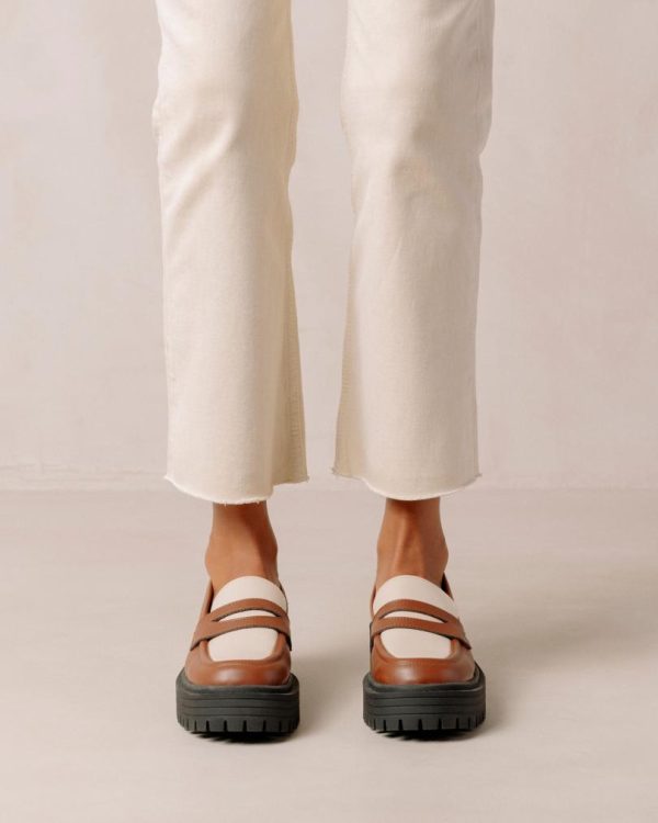 Meet the ultimate chunky loafer from our vegan line. Mask is crafted from white and brown faux leather and topped off with mocassin stitching, penny-bar straps and thick rubber track soles. Designed to be worn in between seasons with anything from skinny jeans to tailored pants on repeat.