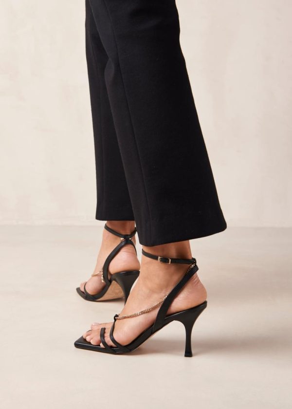 Footwear that feels like jewelry? Yes, please! Made from black leather strips threaded with a polished gold chain, these barely-there sandals will look sultry and glamorous on your feet. Secure them with the buckle on the slim ankle strap, then wow at how comfortable they are – they stand on slender stilettos with a slightly flared base, which makes them perfectly suited for a long night on the dance floor.