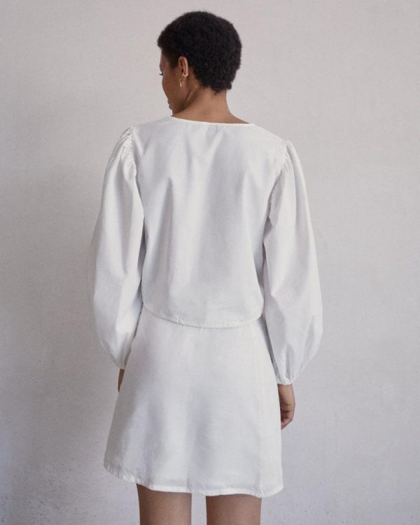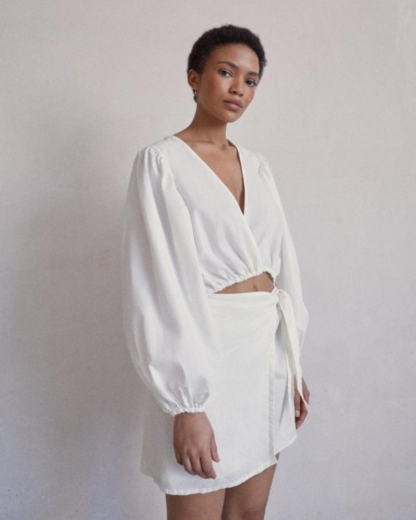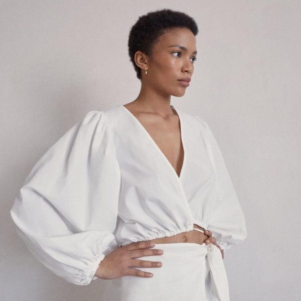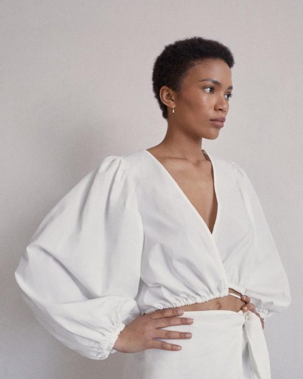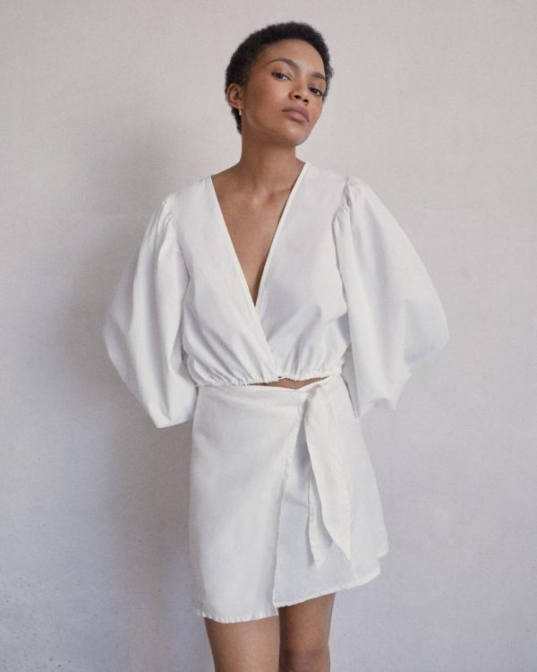 Made from white cotton poplin, the Dazzling top is a warm-weather wonder you will turn to for sunny weekends of socializing. It’s designed in a wrap silhouette with voluminous puff sleeves gathering at the cuffs and a plunging neckline that frames the decolletage. An easy-to-wear blouse that can be dressed up or down – just add the right accessories to make it a summer hit.